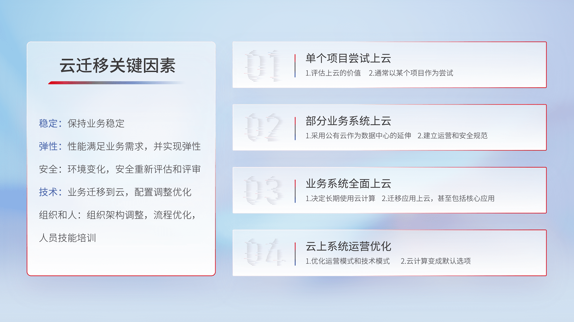 结合实际业务,,,从规划设计、、云平台选型、、、云原生改造、、、、数据迁移、、、集成交付,,迁移全过程为客户识别最佳上云路径,,,做好风险识别管理,,,设计网络架构、、、身份权限、、、安全审计合规、、、、操作审计、、日志审计、、、监控告警策略、、、多站点容灾设计等,,,对云上基础设施进行整体规划,,,提升IT治理水平,,,以满足弹性、、高可用、、、高性能的需求。。