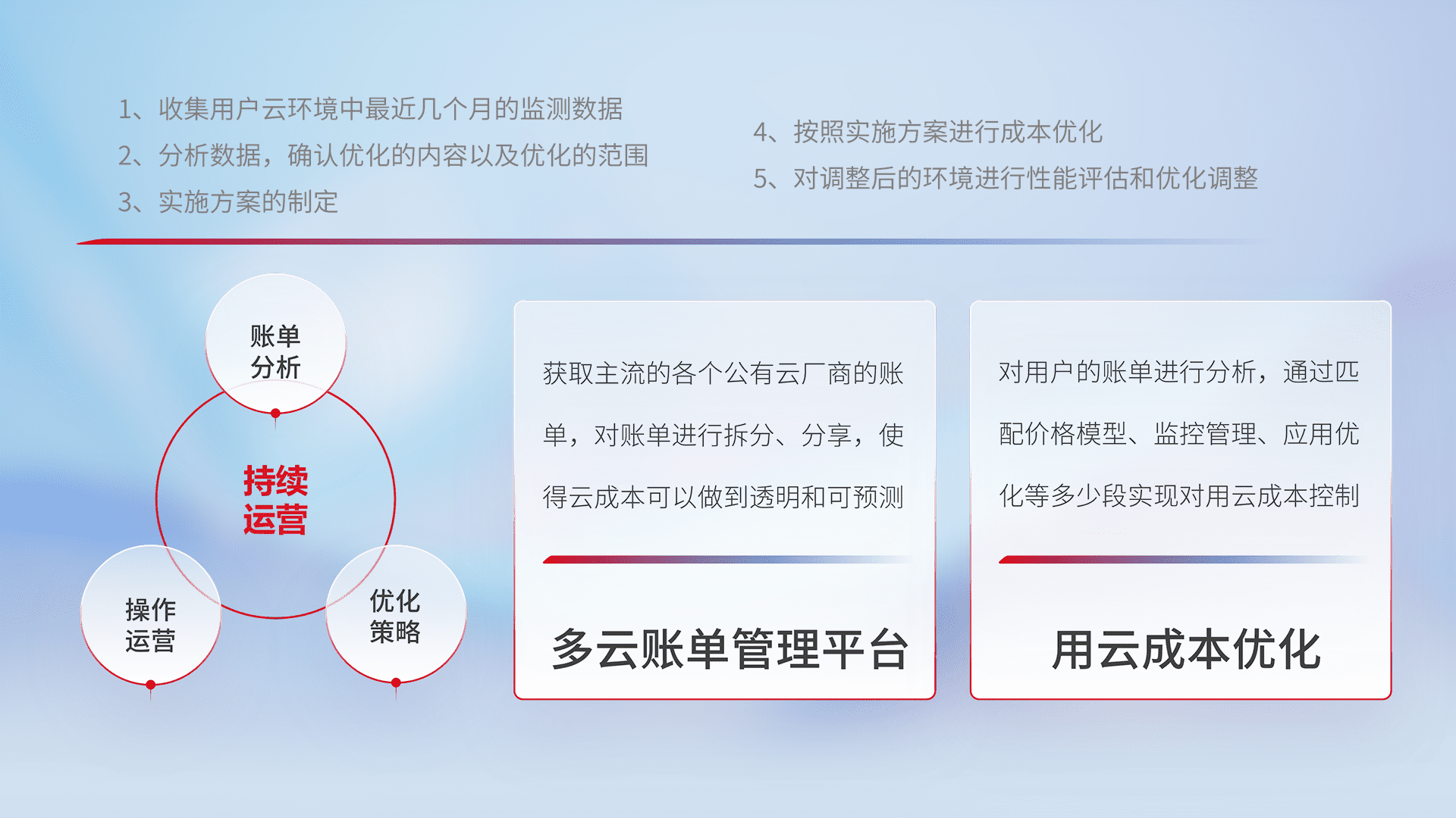 通过多云纳管,,,以统一的资源数据模型把客户的云资源进行抽象和封装,,,,进而实现对多云资源的统一操作,,保障云资源管理的可靠性、、、稳定性与可用性。。。。量身定制化运维内容,,,配置、、、、开发运维、、、、补丁管理、、、备份、、监控、、、认证和访问管理、、、、审计和日常巡检等,,,,保障在用云过程中的可靠度,,,,稳定度以及高可用率。。